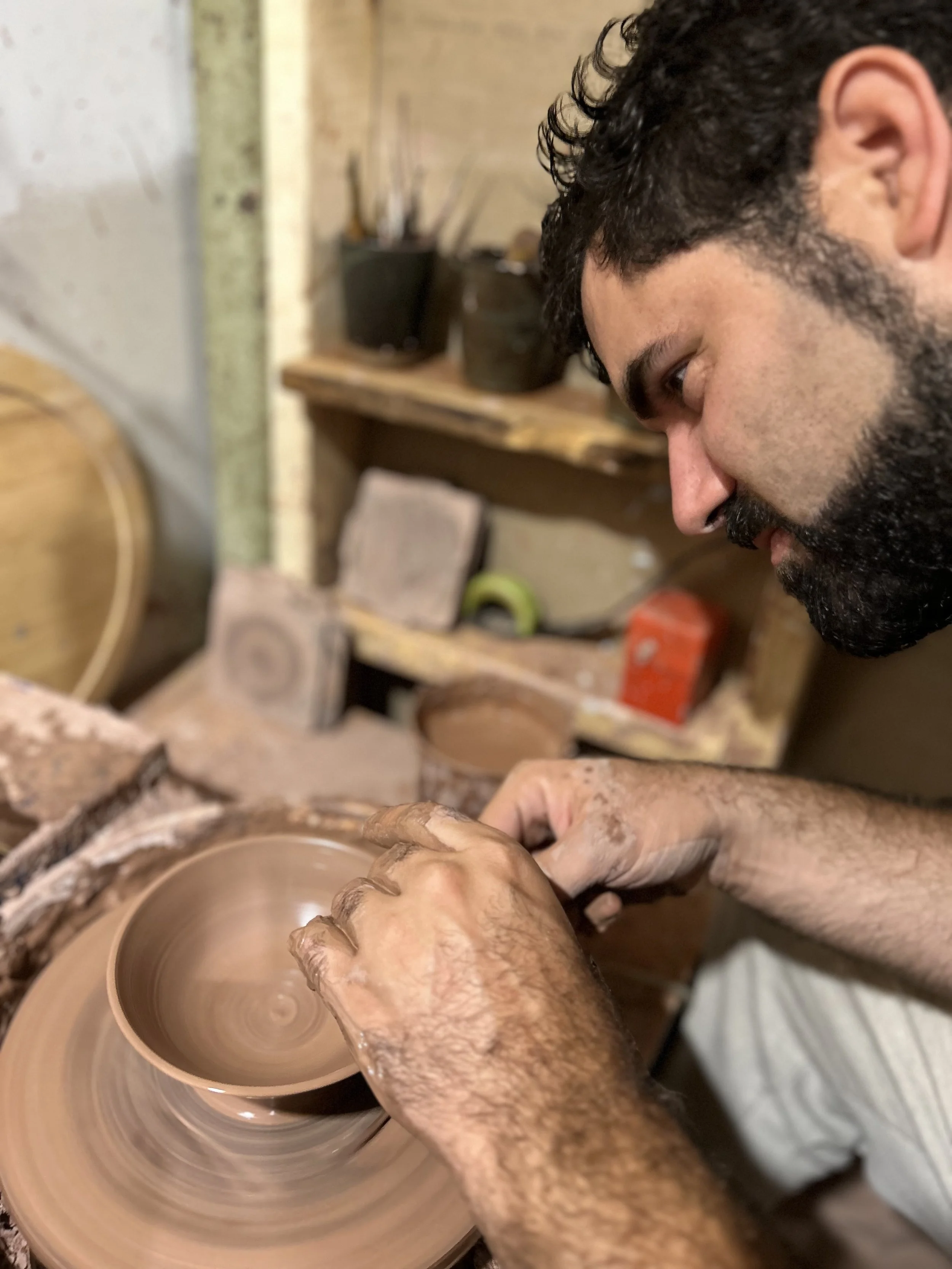 I wear many hats these days: I am a husband to an amazing woman and father to three beautiful children. I am a teacher at Green Meadow Waldorf School, teaching crafts to grades 5-12. I am a potter, woodworker and maker. In all the realms of my life, service, sacrifice and love are at the center. My first instinct has always been to help others and to put other peoples needs before me. Throwing pots allows me the time to be with myself in quiet, to focus and recenter myself. I throw, trim and glaze all the pots myself; working in small batch sessions. Since graduating from the School for American Crafts at Rochester Institute of Technology in 2012, I have been living with the dream of starting a pottery business that showcases a body of work that is “mine.” I’m this past year (2025), I have put my efforts and energies towards that goal. I am so excited and proud to begin taking the ideas from the last decade and creating them for others to hopefully enjoy as well.